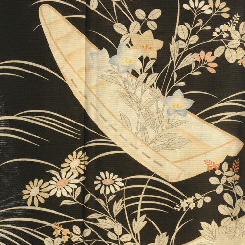 ■0532-39-7660 標準サイズ 身長・・・150cm〜159cm位 洋服サイズ・・・9号〜13号位まで 商品説明 黒地に芦舟と涼感を誘う流水と秋草がなんとも優美な 表情を醸し出す逸品です。